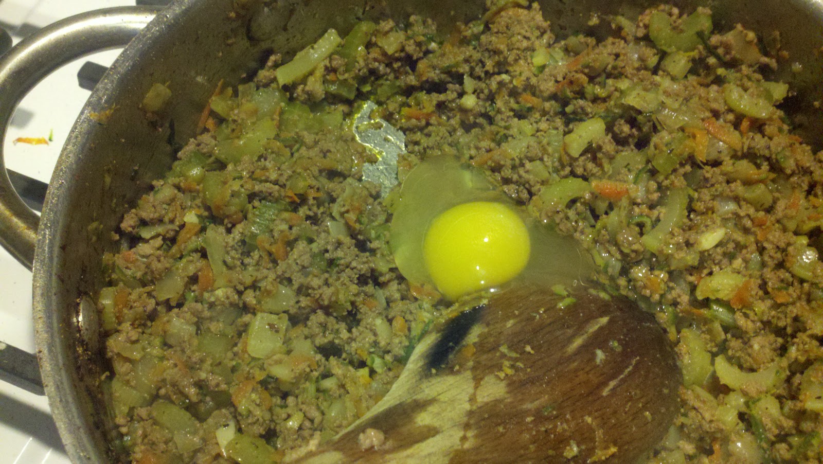 I start with a large pan and some olive oil. Drizzle your olive oil and add one small chopped onion and about 4-5 celery stalks, chopped. cook until tender and add two shredded zucchini and 2-3 shredded carrots. cook on medium heat for 2-3 minutes. Add 2 chopped cloves of garlic. Add 1 pound of ground beef and cook through. Add 1 egg to the pan and cook into the meat. It gives the mixture a silky texture. Once the mixture is cooked set aside.